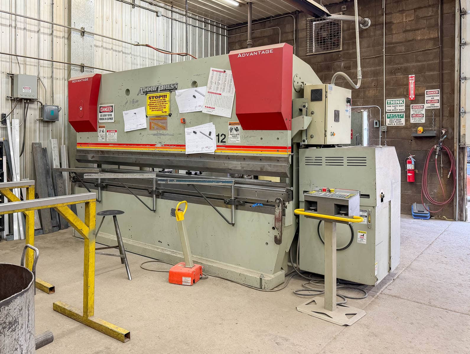 Powerful CNC-controlled hydraulic press brake for precise bending and forming of heavy-gauge stainless steel.